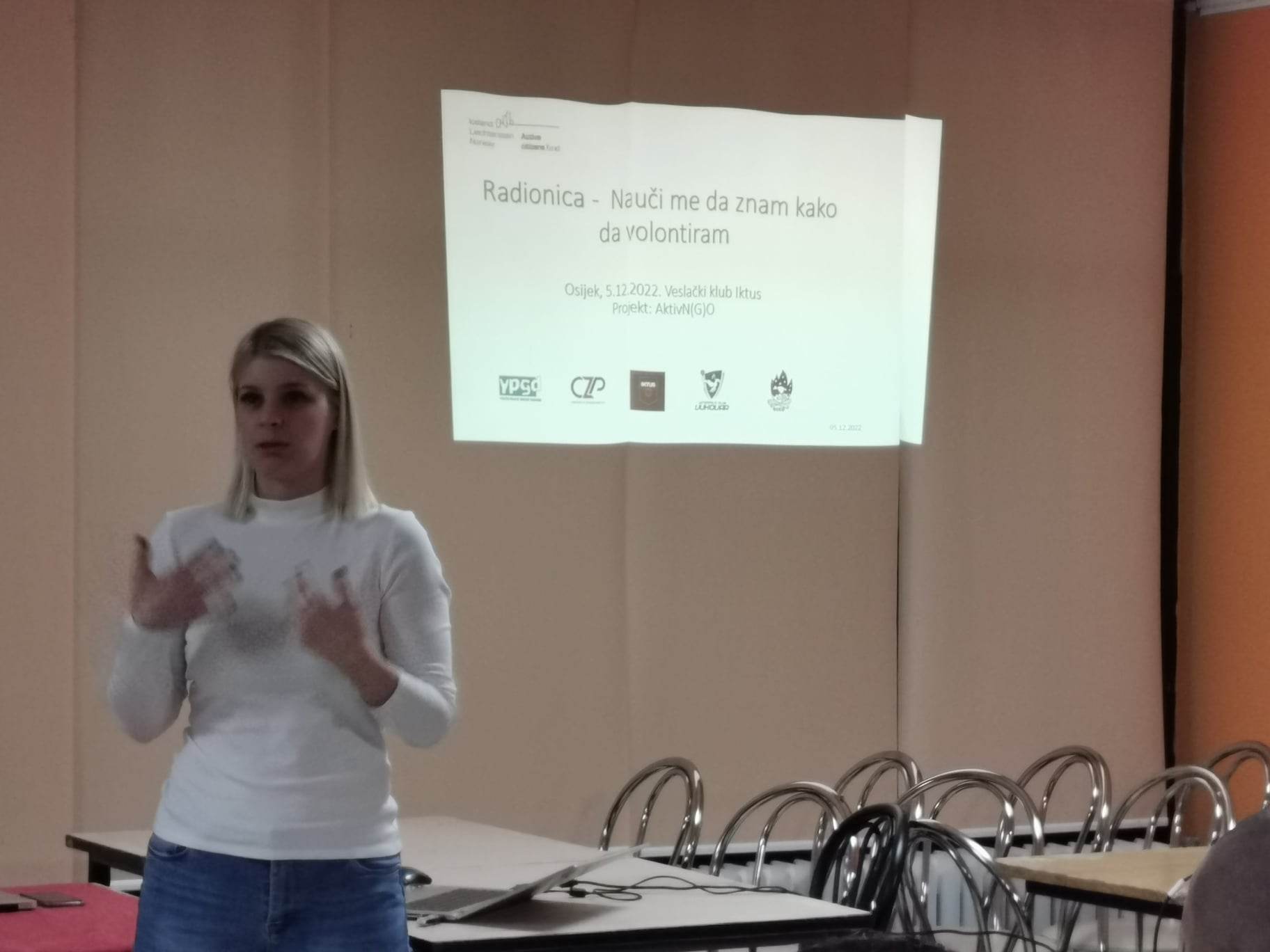 Radionica je bila namjenjena svim volonterima i onima koji se žele uključiti u volonterske aktivnosti kako Veslačkog kluba Iktus tako i u drugim klubovima i zajednici. Vodila ju je suradnica i volonterka VK Iktusa, Stefani Šešum .Projekt “ActivN(G)O provode Youth Peace Group Danube YPGD kao nositelj projekta u partnerstvu s Veslačkim klubom Iktus , Vaterpolo klubom Vukovar , Centrom za poduzetništvo I organizacijom iz Norveške - ECCO (Exploring Cultural Campfire Opportunities)